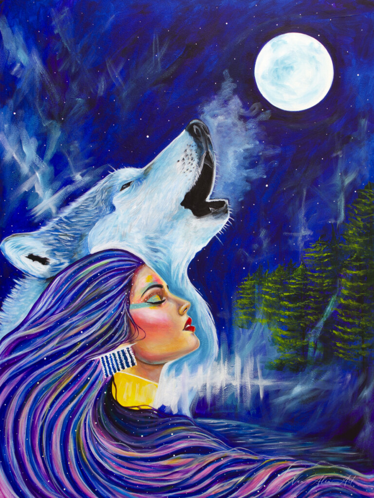 This is a painting honoring Grandmother Moon. In many traditions Grandmother Moon was placed by the Great Spirits to watch over the children of the Earth. She helps you with your dreams and visions. Grandmother Moon is the leader of feminine life. Her teachings involve the intuitive and introspective realms of life. She has a strong connection with the cycles of life.