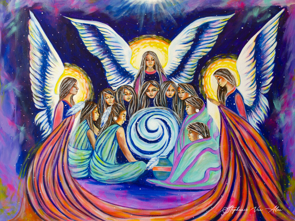 The process I went through when creating this painting is: I place my intention to paint on a particular theme or purpose. In the case of this painting, it was to honor the grandmothers. I then select colors at random and paint a background of an undefined and ambiguous space, letting the colors appear as various shapes, lines, etc. I then focus my intention on my purpose and notice what begins to appear in the background on the canvas. I just let the images appear and develop them. As the images begin to appear, I interact with them, letting them speak to me and inform me of their meanings connecting with them outside of time and space in the realms of the imagination and non-ordinary reality.