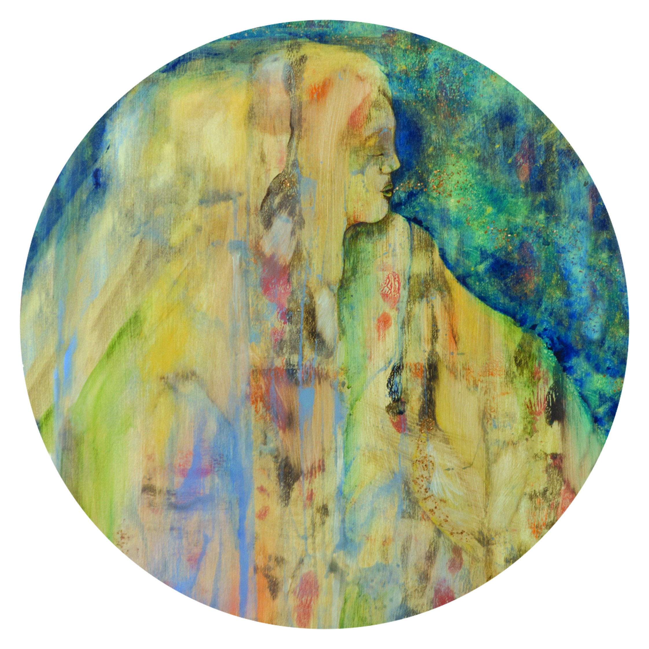 This is a painting honoring Grandmother Moon. In many traditions Grandmother Moon was placed by the Great Spirits to watch over the children of the Earth. She helps you with your dreams and visions. Grandmother Moon is the leader of feminine life. Her teachings involve the intuitive and introspective realms of life. She has a strong connection with the cycles of life.
